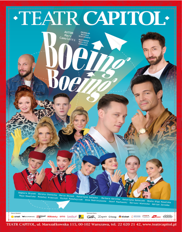 „Boeing Boeing” – komediowa uczta w gwiazdorskiej obsadzie! Przygotujcie się na szalony lot nieprzerwanej zabawy, miłosnych zawirowań i wybuchowego humoru. Poznajcie Maksa – mężczyznę, który myśli, że opanował sztukę poligamii, korzystając z… międzynarodowego rozkładu lotów! Trzy narzeczone, trzy różne linie lotnicze, jeden perfekcyjny plan – co mogłoby pójść nie tak? Wszystko, gdy nagle pojawiają się one…wszystkie trzy w tym samym czasie! Przed katastrofą za wszelką cenę próbują ratować niepoprawnego amanta ekscentryczna gosposia Nadia oraz przyjaciel z młodości Paweł. Ta błyskotliwa, pełna energii, najlepszego dowcipu i zaskakujących zwrotów akcji farsa, to gwarancja niepohamowanego śmiechu i doskonałej dwugodzinnej rozrywki. Spektakl rozbawił już miliony widzów na całym świecie – teraz czas na Ciebie! PS.”Boeing Boeing” w 1991 roku trafił do Księgi Rekordów Guinnessa jako najczęściej wystawiany spektakl, a jego popularność wciąż rośnie! Reżyseria: Wojciech Adamczyk Przekład: Bartosz Wierzbięta Scenografia & Kostiumy: Katarzyna Adamczyk Reżyser castingu: Magdalena Sowa Kierownik produkcji: Julia Byrzykowska